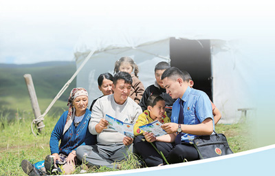新疆维吾尔自治区哈巴河县检察院检察官在那仁夏牧场开展生态环境法治宣传工作。